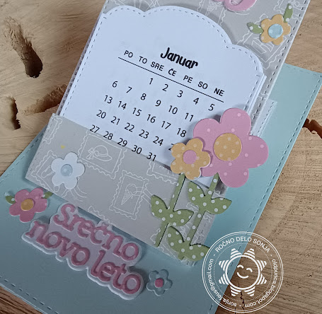 Za izdelavo "nosilca" koledarja sem uporabila potiskani papir. Namontirala sem ga kar na osnovo za voščilnico, da ga lahko pošljem po pošti, okrašen pa je z rožicami, ki so prav tako izrezane iz potiskanega papirja. Da koledar lepo stoji, skrbi voščilo prilepljeno na debelejši papir. Med svojo zalogo sem našla en kup pivnikov, za katere nimam pojma, kako so zašli k meni. Barvati se ne dajo, se pa lepo režejo in so idealni za dodajanje dimenzije izrezom. Vsi uporabljeni ustvarjalni pripomočki, tudi potiskani papir, so Najlepši par. Tina, hvala za koledarček.💕